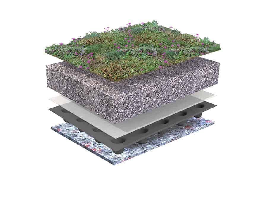 De opbouw bestaat uit vier belangrijke lagen: een wortelwerende laag die de dakbedekking beschermt, een drainagelaag die water opvangt én afvoert, een licht maar voedzaam substraat en de kruiden–sedummat. Samen zorgen deze onderdelen voor een duurzaam en stabiel groendak dat tegen extreme weersomstandigheden kan en weinig onderhoud vraagt.